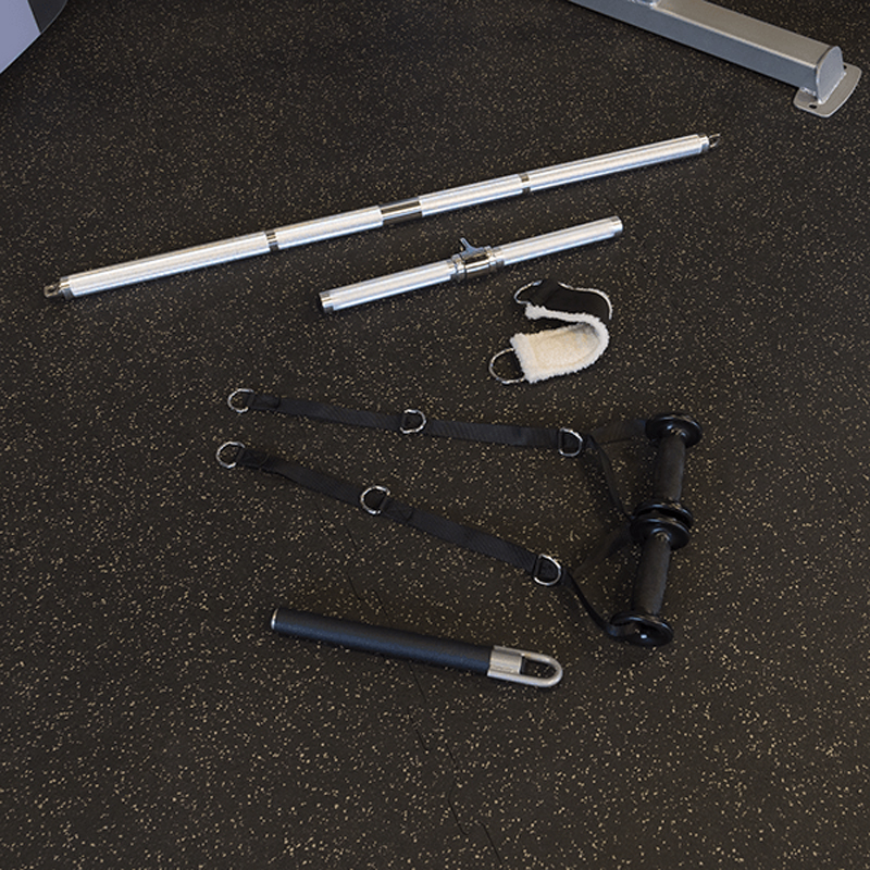 14” padded athletic bar, two adjustable single handles, an ankle strap, a 42" long straight bar, and a 20” revolving straight bar
