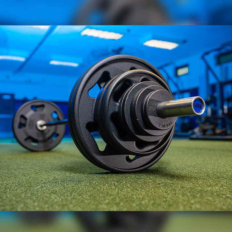 Olympic bar and 2.5, 5, and 10 lb. plates Not included