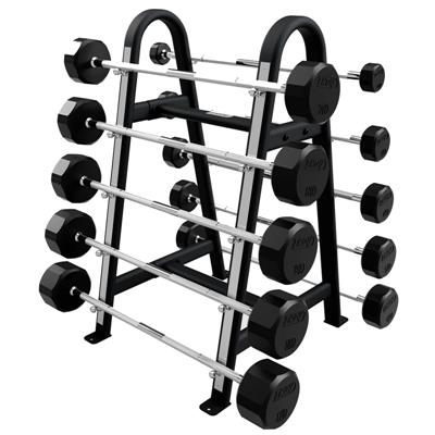 - Capacity: Holds 10 fixed barbells or curl bars.