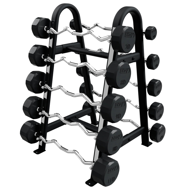 Troy COMMPAC-TZBR110 12 Sided Rubber Curl Bar Set - 20 to 110LB with Black Rack