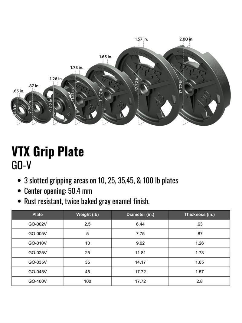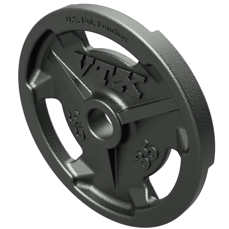 Affordable quality, our VTX high-grade, wide-flanged, Olympic Grip Plates feature 3 slotted gripping areas (45 lb., 35 lb., 25 lb. and 10 lb. only) that actually raise the plates off of the ground, providing easier lifting and loading from a prone or angled position. Raised reinforcements on both sides of each grip slot help make it a true institutional plate and the choice of trainers, world wide. Center bores are precision drilled for a snugger fit on most 2” Olympic bars. Rust resistant, twice baked gray enamel finish. Warranty: 1 year.