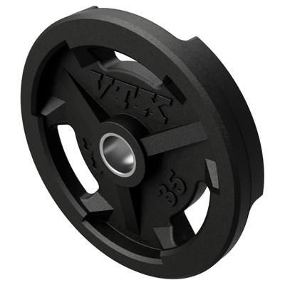 VTX high-grade, wide-flanged "Quiet Iron" Olympic Grip Plates deliver top-tier durability, convenience, and equipment protection at an affordable price. The three-slotted grip design (available on 45LB, 35LB, 25LB, and 10LB plates) allows for easy lifting and loading, while the rugged rubber encasing protects your plates, floors, and other equipment from damage. Raised reinforcements on both sides of each grip slot ensure enhanced strength, making these plates a trusted choice for trainers worldwide. The new steel center bore insert provides a secure and snug fit on most 2” Olympic bars.