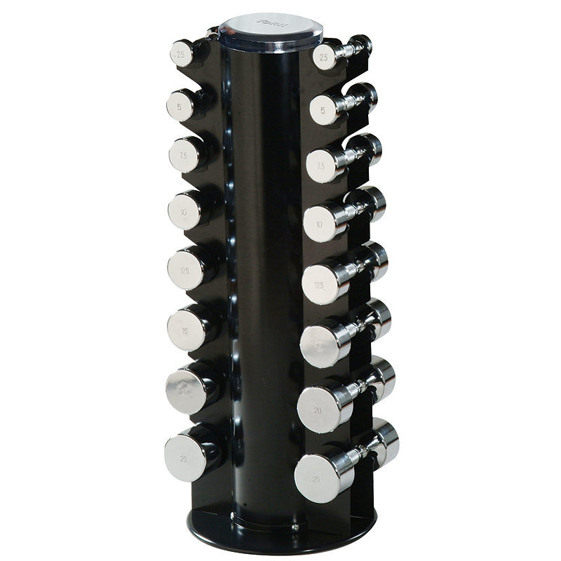 - Holds 8 pairs of dumbbells - Rubber Hex (up to 35 lbs) or Chrome Dumbbells (up to 50 lbs).