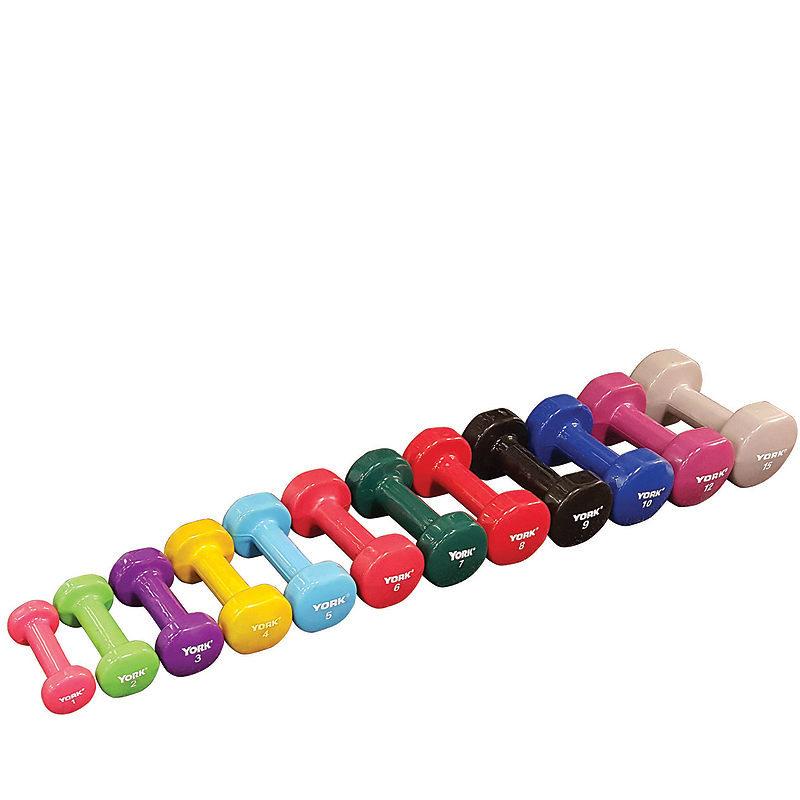 York Barbell Vinyl Fitbells. YORK Fitbells are solid cast-iron dumbbells coated with thick vinyl for maximum comfort, safety, and style. The vinyl is durable and easy to clean. These brightly colored dumbbells are prefect for aerobics, jogging, power walking, and general exercise. The colorful YORK Vinyl Fitbells are excellent for group classes offered in clubs.